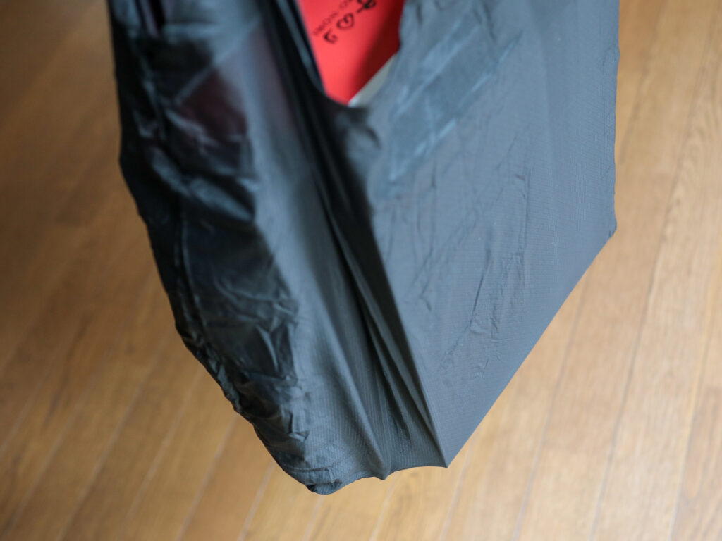 内側に縫い付けられた収納袋にぐしゃぐしゃと端からテキトーに詰め込んでいってもいいし、半分半分にざっくり折りたたんでいってくるくる丸めて詰め込んでもいい。
