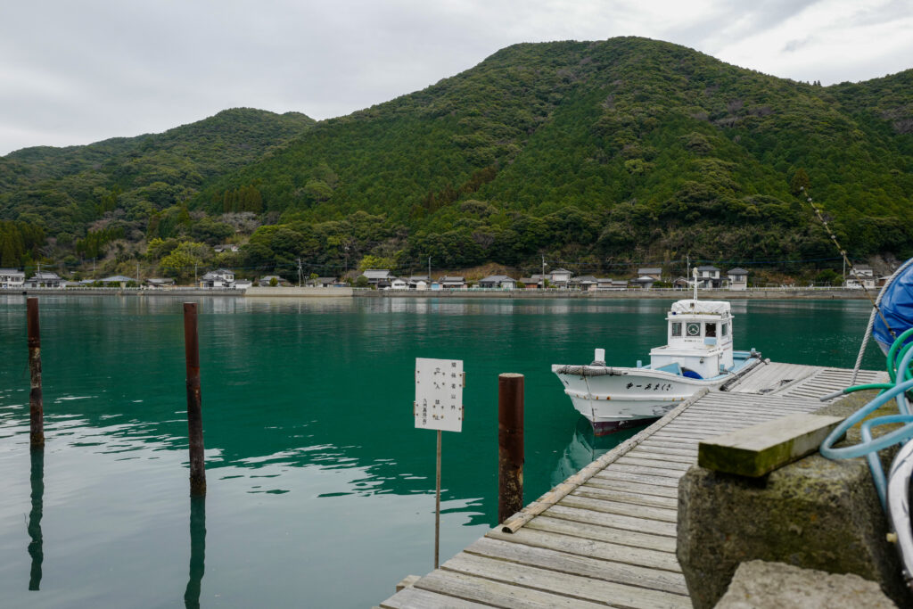 ちょうど一瞬だけ晴れ間がのぞいて、碧い海と山の間に佇む崎津のちいさなちいさな集落がきれいに見えた。