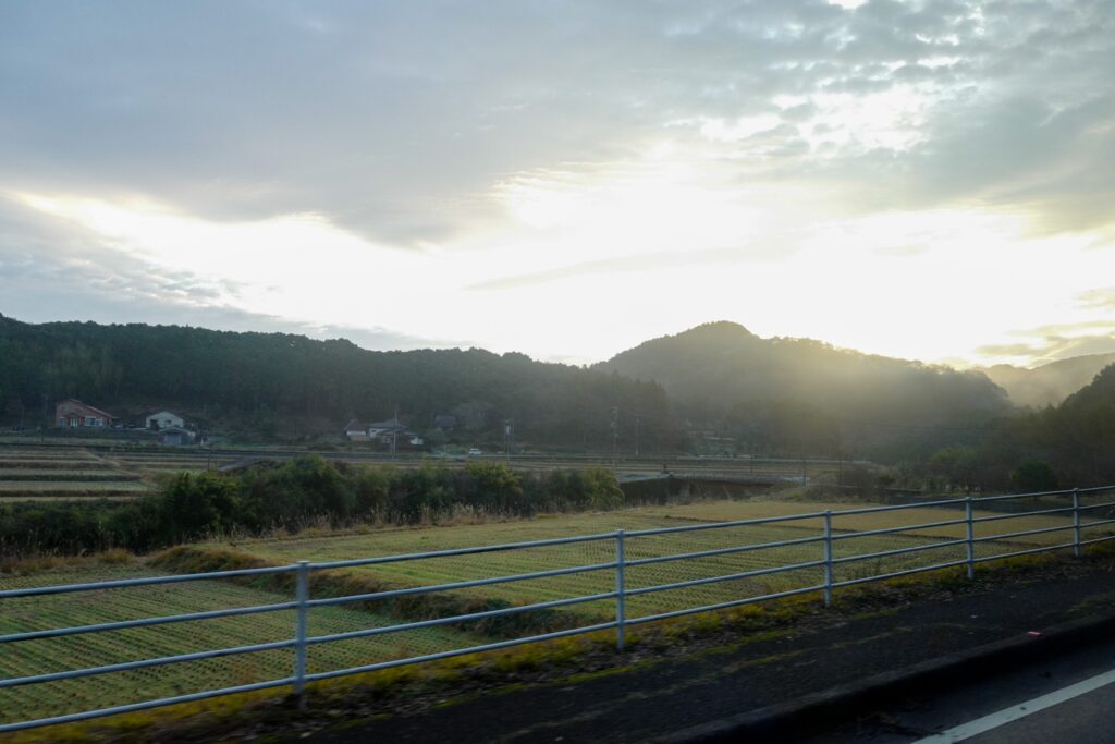 山を上って山を下って田んぼの中を走っている頃、日が昇った。