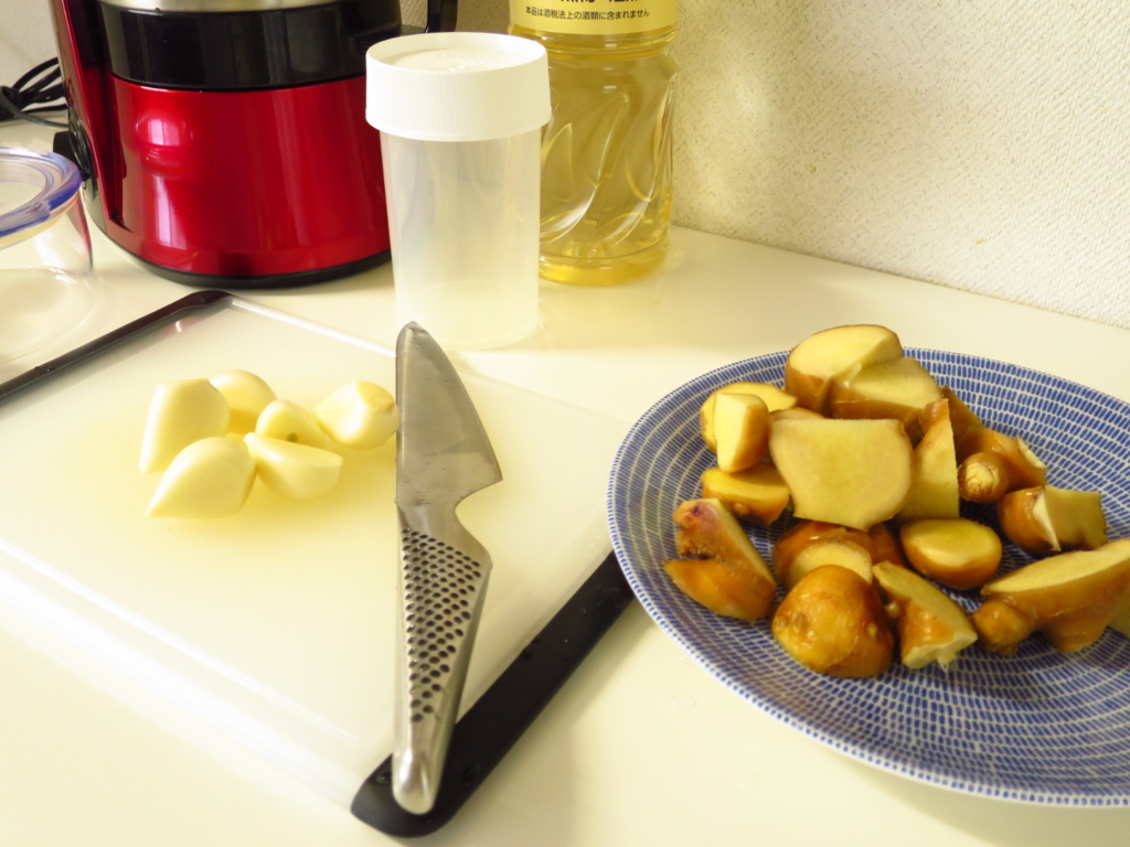 今回はたまたましょうがが二つあったので、しょうが丸ごと二つと、にんにくまるごと一個を全部使っちゃいます。