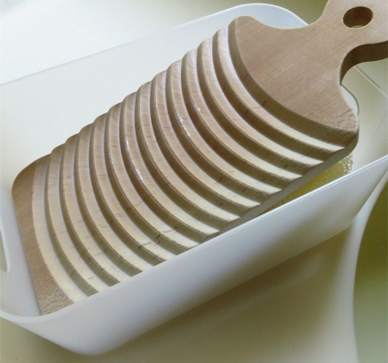 無印のポリプロピレンメイクボックス1/2に、無印のせっけん置きに載せた洗たく石鹸と、ちいさな洗濯板をセット。