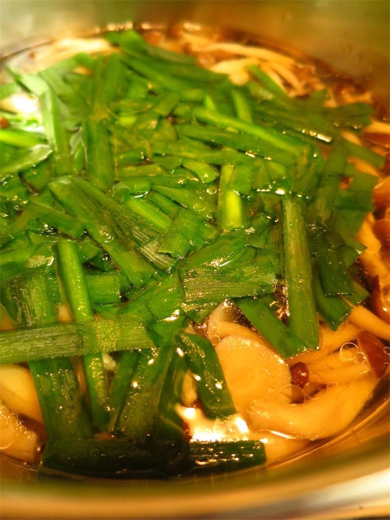 茹で汁は、冷凍しておいたニラとキノコを加え、醤油と酒、コショウで味を整えて、スープに。ノー包丁料理。